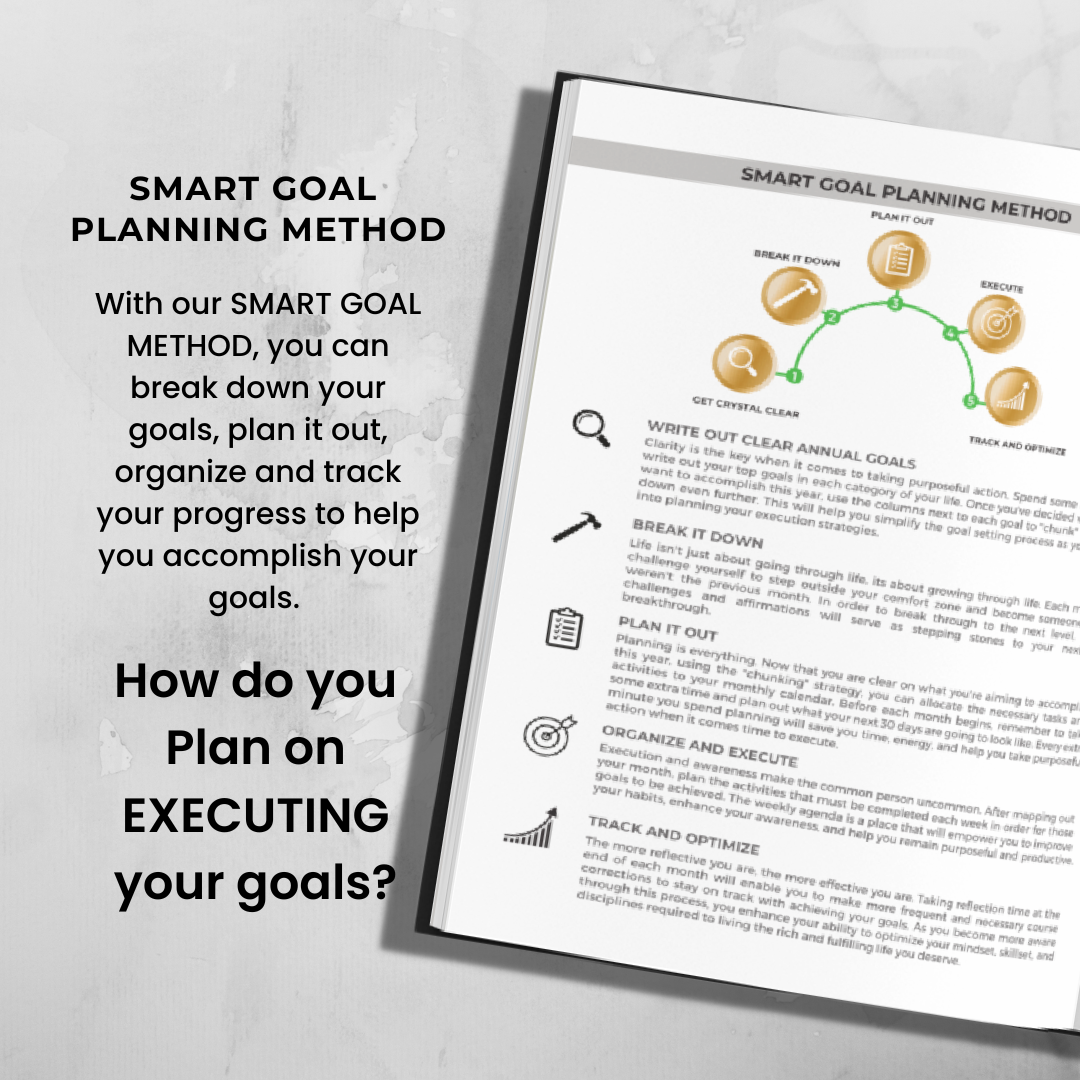How do you plan on EXECUTING your goals? With our SMART GOAL METHOD, you can break down your goals, plan it out, organize and track your progress to help you accomplish your goals.