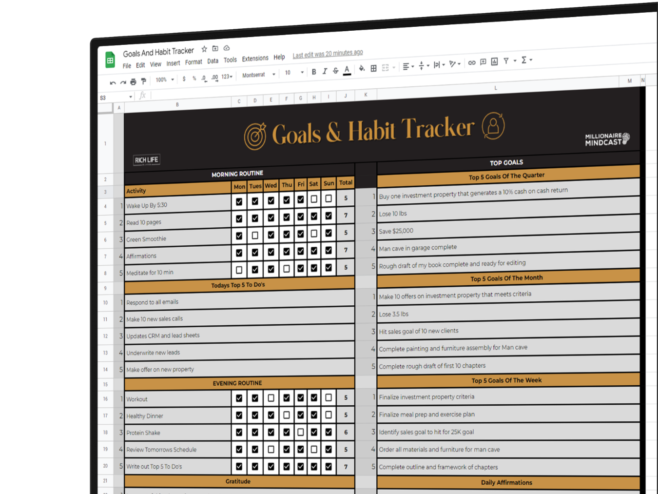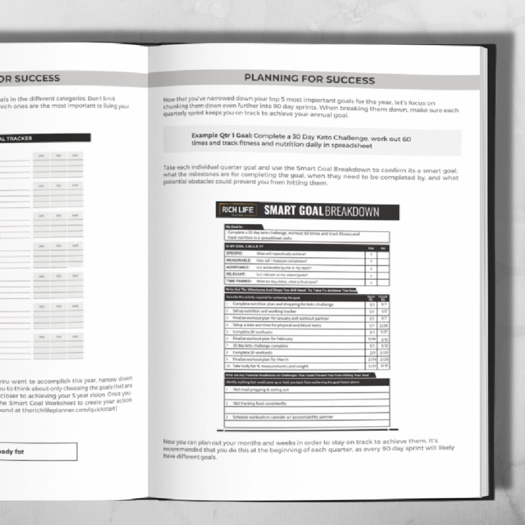 The Rich Life Planner + Digital Tools + Video Tutorials includes everything you need. Annual Goal Setting & Tracker, Vision Statement, Quarterly Goals Tracker, Monthly Goal Tracker, Monthly & Weekly To-Do's Tracker, Habit Tracker, Affirmations, Daily Gratitude, Monthly Reflection, Weekly Challenges, Notes and more!